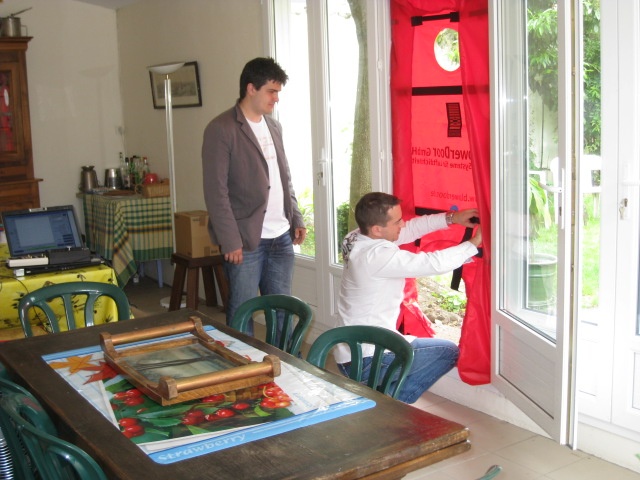 photo représentant la pose d'une blower door par deux techniciens , aux prémices de l'infiltrométrie en 2010