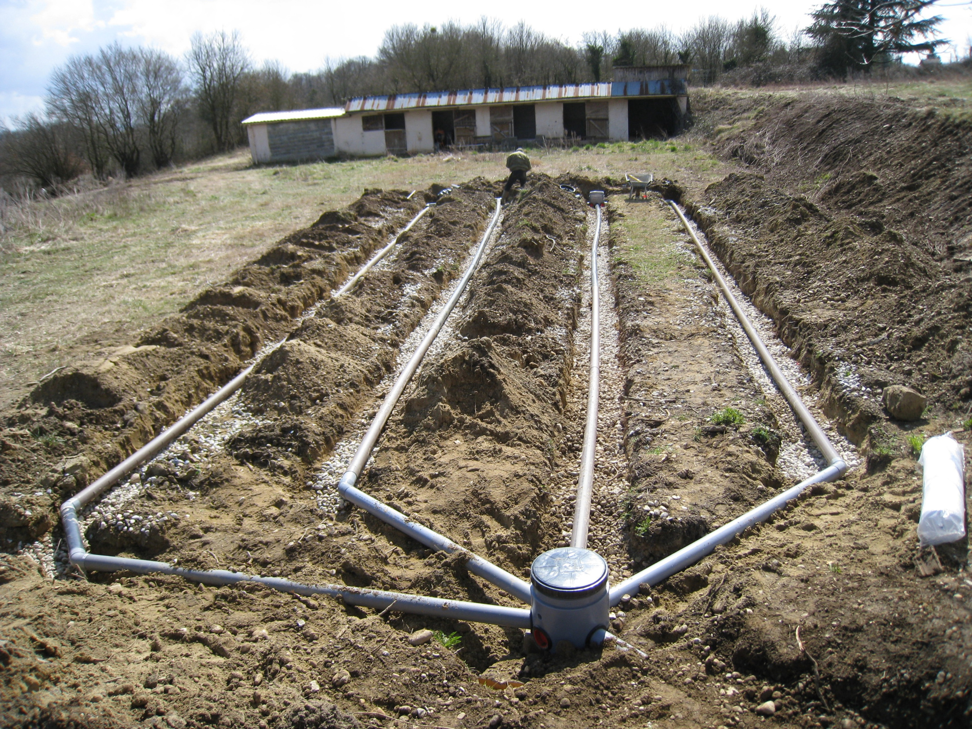 la fosse toutes eaux avec son réseau de ventilation primaire et secondaire, et le dispositif d’épuration adapté à la surface du terrain, selon l’un de ces dispositifs suivants :